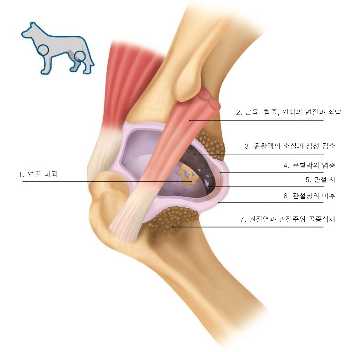 연골 파괴가 일어나면 파괴된 조각들은 관절 내에 있는 관절액으로 떨어져 나가며 이것들이 주위 조각들과 마찰을 일으켜 염증반응이 나타나게 됩니다. 이런 일들이 오랜 시간 지속되면 연골은 얇아지게 되고 결국엔 없어져 뼈가 노출되게 됩니다. 결과로 관절은 더 이상 부드러운 운동이 불가능하게 되며 경직이 일어나게 됩니다. 그리고 뼈 모양의 변화가 일어나게 되고 뼈 가장자리 부분에 ‘골증식체’라 불리는 뼈가 자라나게 되어 튀어나오게 되고 관절 변형이 일어나게 됩니다.