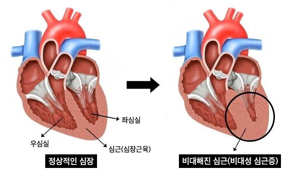질병의 말 그대로 심장의 근육이 두꺼워지는 것, 심장의 근육이 두꺼워지면서 심장 안쪽(혈액이 차게 되는 공간)이 좁아지게 되어 혈액 유입이나 심장 박출에 장애를 줍니다. 이런 경우 심장은 전신 순환을 위해서 혈압이나 심박을 올리는 보상적인 기전을 가지게 되는데 심해지는 경우 심장이 보상 능력을 잃어 혈압도 심박수도 오히려 낮아지게 되어 매우 위험해집니다.