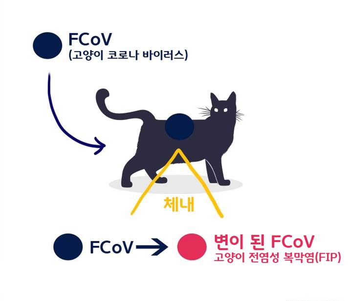 고양이 코로나바이러스에 감염된 고양이가 전부 FIP로 진행되지는 않는다. 일반적으로 고양이 코로나바이러스에 감염된 경우 임상증상이 없거나 약간의 설사가 있다. 따라서 임상증상이 없는 고양이는 고양이 코로나바이러스의 보균자로 남게 되고 다른 고양이에게 바이러스를 전파시킨다. 고양이 코로나바이러스에 감염된 어떤 고양이라도 FIP를 유발하는 바이러스로 변이될 수 있다. 이러한 변이의 기회는 아주 어린 고양이 혹은 아주 나이 많은 고양이에서 면역계의 미흡으로 가능성이 더 커진다. 또한 유전적 특성이 바이러스의 변이에 민감성이 있을거라고 생각되고 있다.
